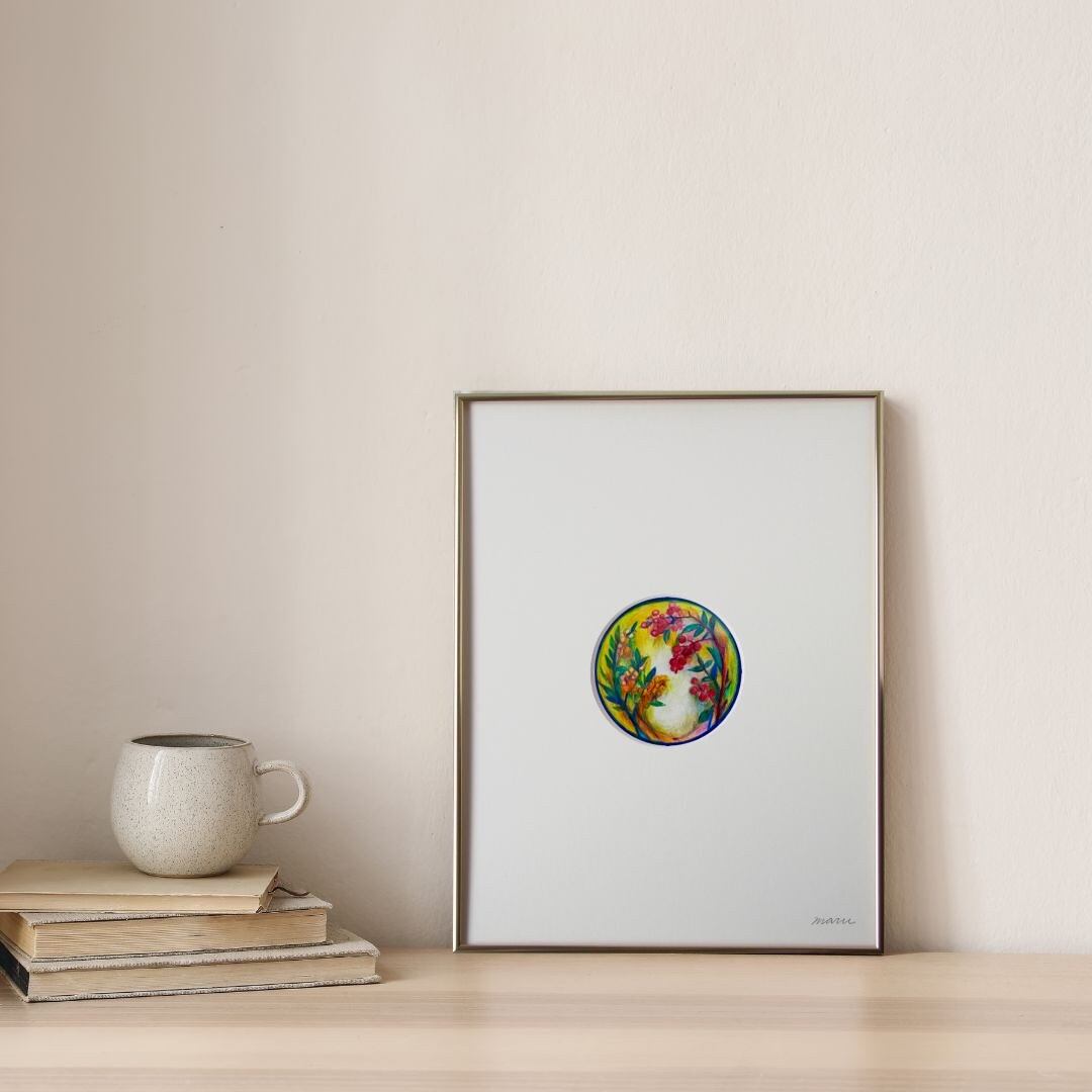 宝石のようにキラキラと輝く、生き生きとした花の様々な表情を直径10㎝の丸い世界の中に、色鉛筆を使い色鮮やかに表現しました。