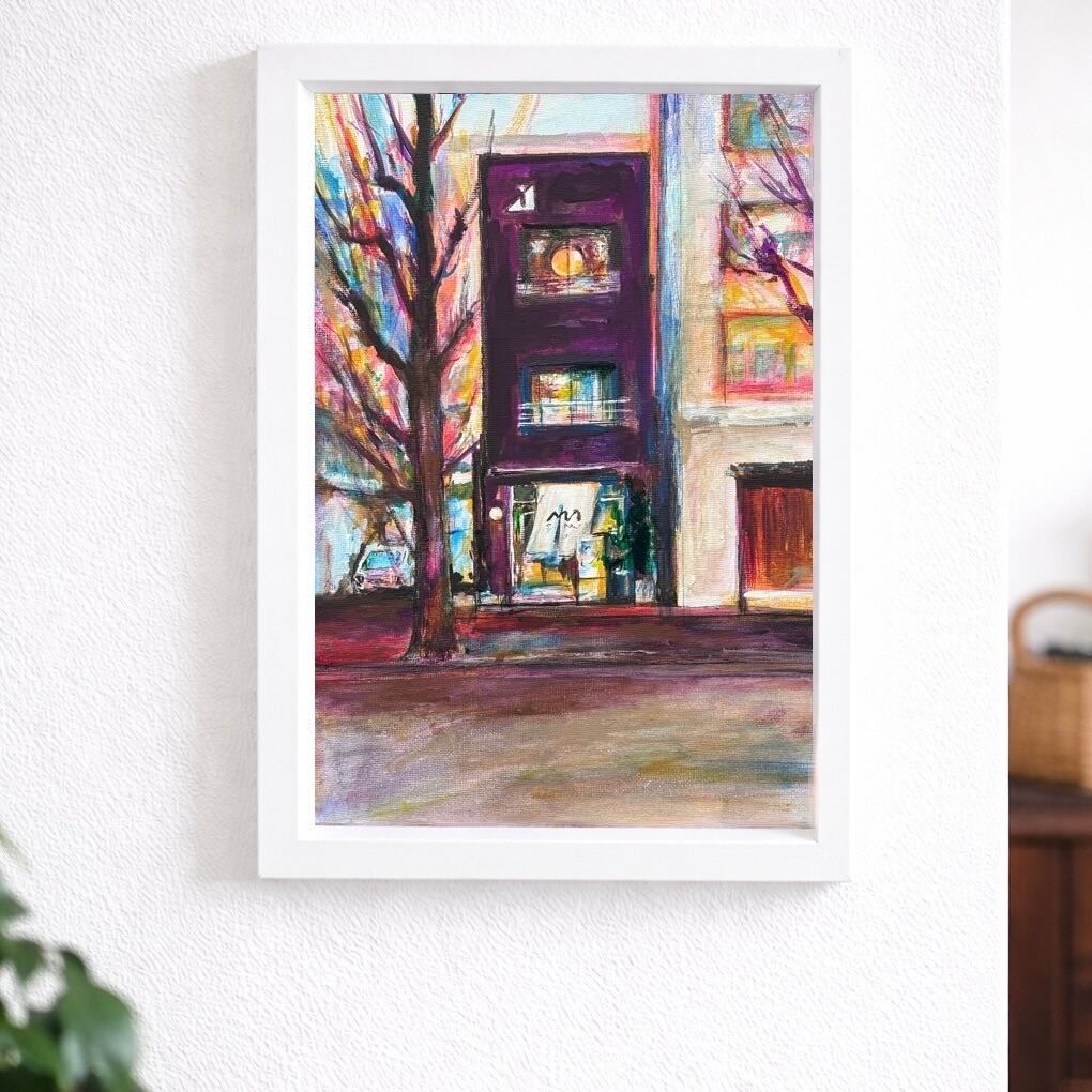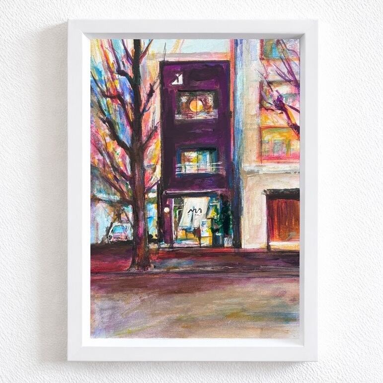 個展会場となる設計事務所1階のカフェの外観を描いた作品です。