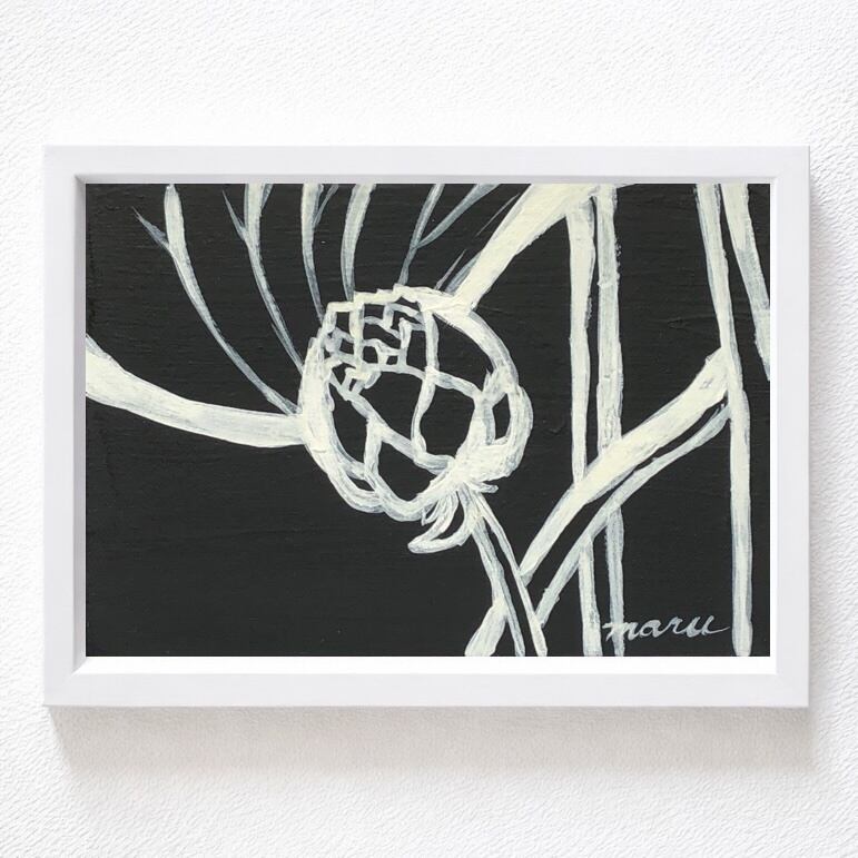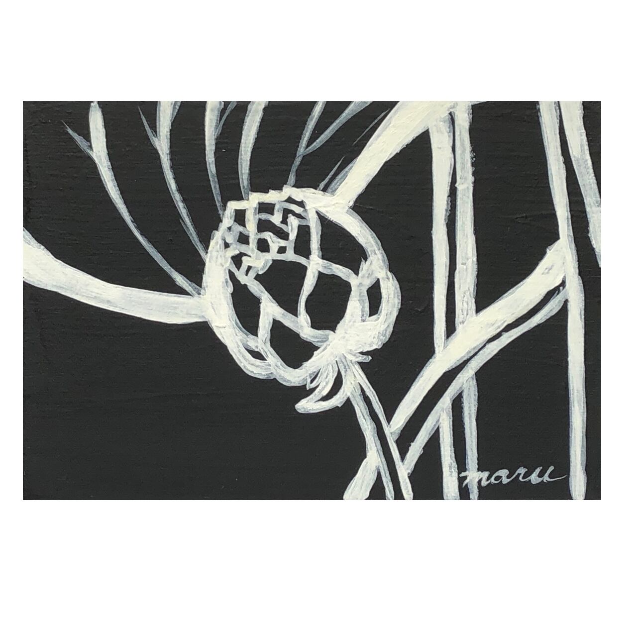 黒地に白い絵の具で描いた蓮の花。