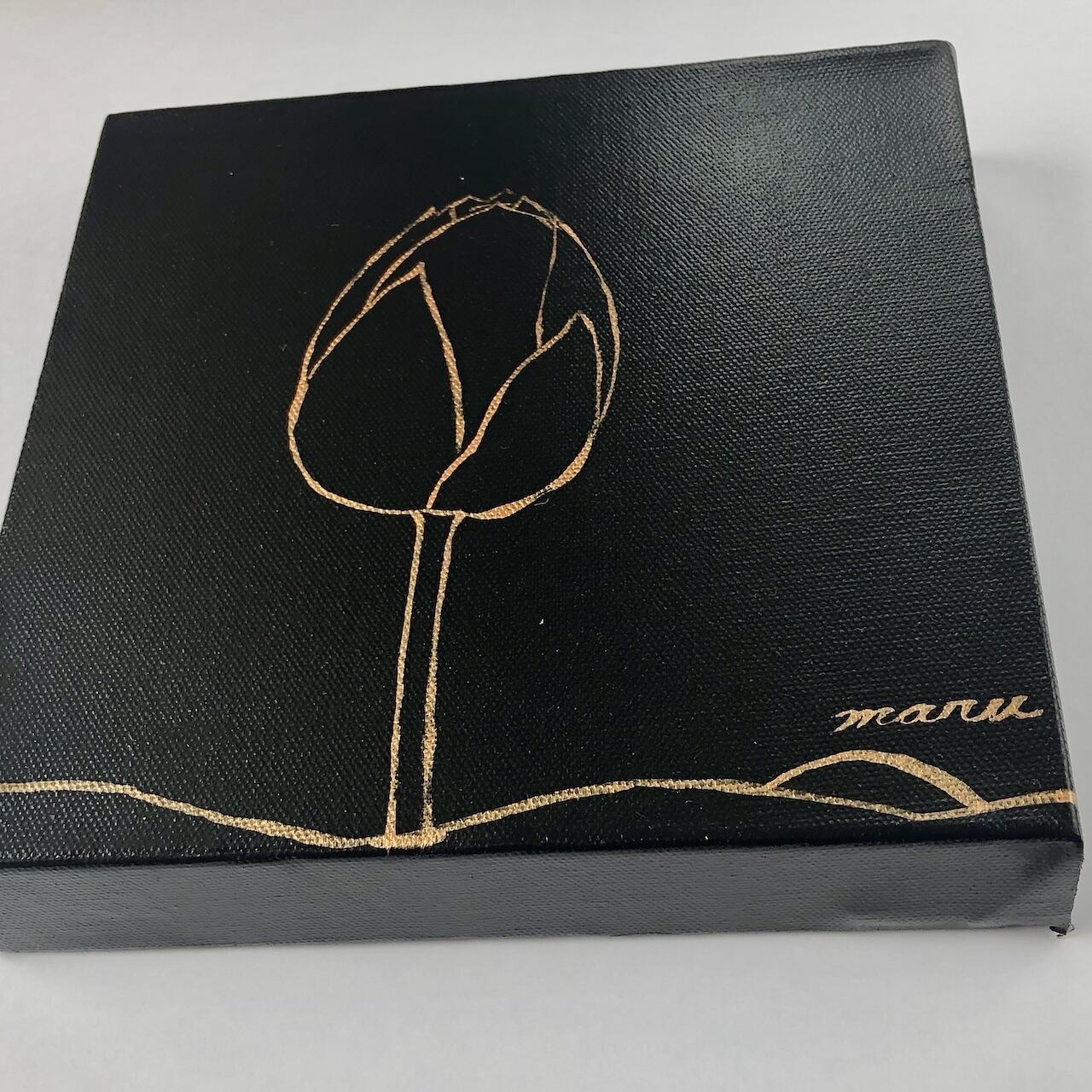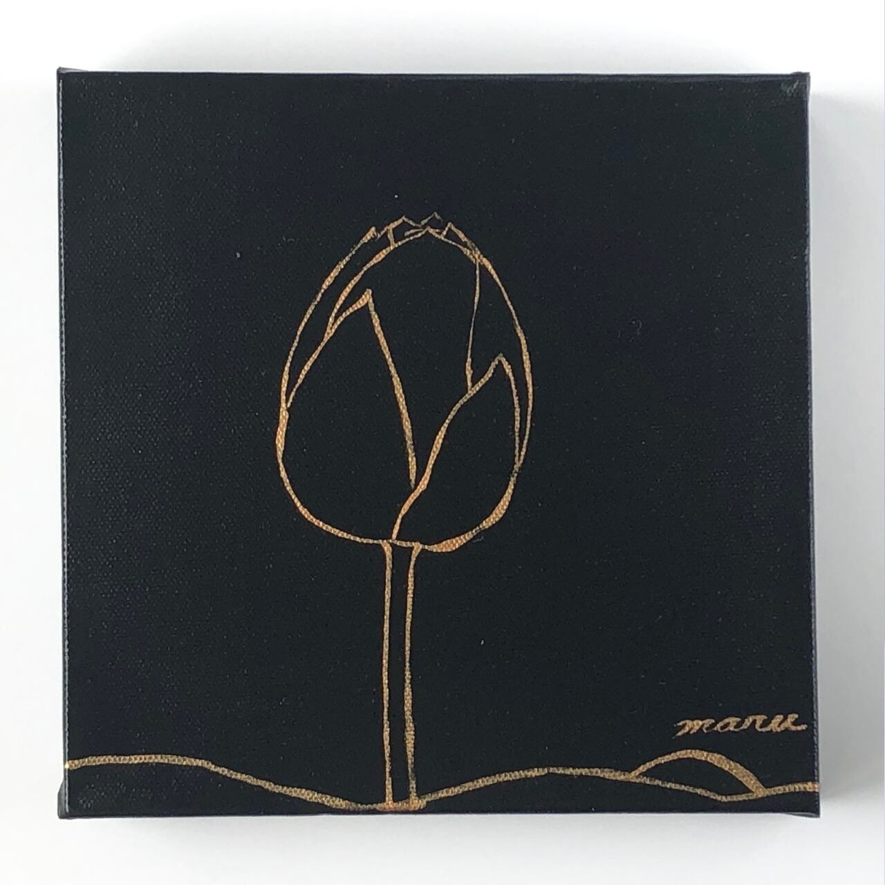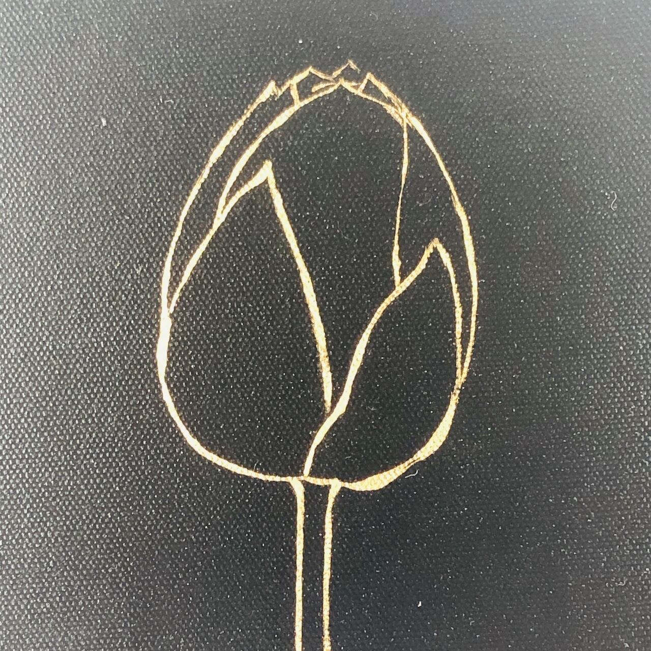 黒い背景に、金の線でふっくらとした蓮の蕾を描いた作品です。