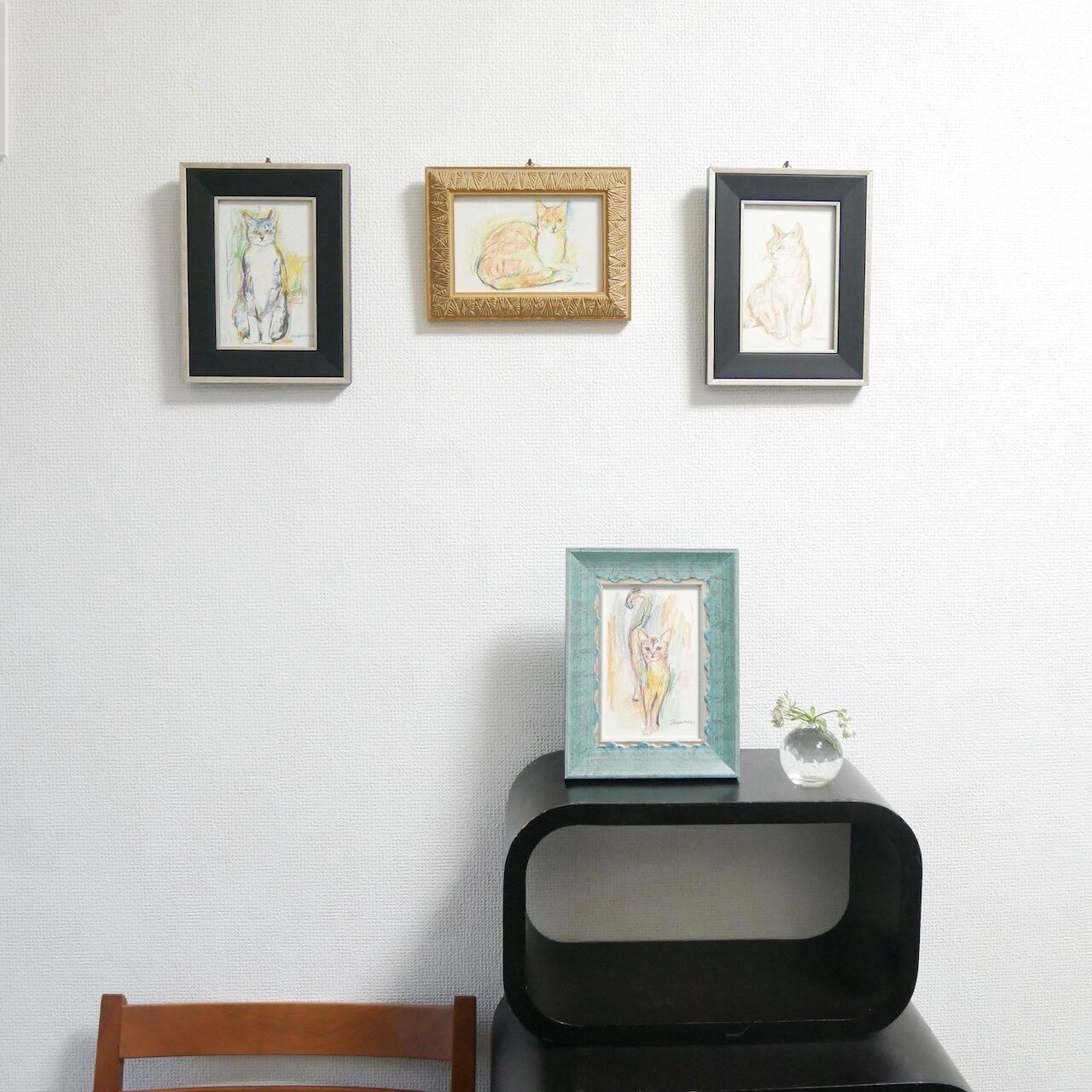 数枚の猫の絵を並べることで、空間に変化とリズムが生まれるます。