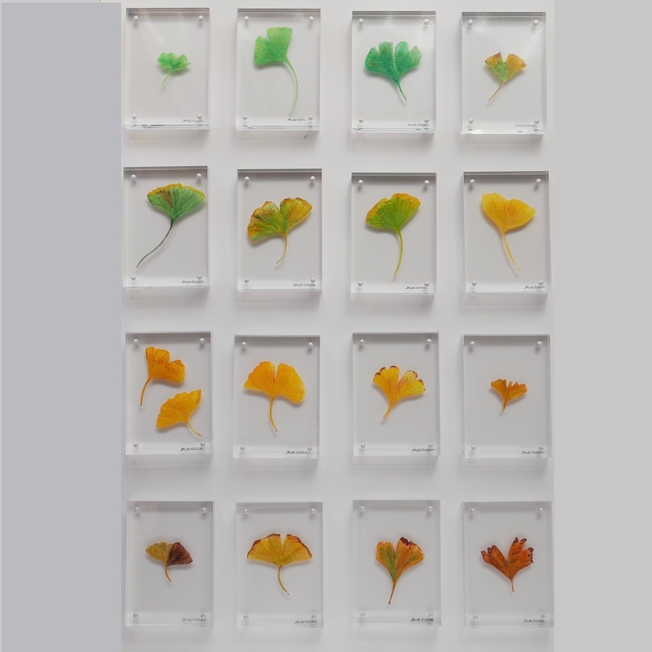 アクリルのフレームに挟まれた作品は、表からも裏からも鑑賞でき、光を通すことで、葉の姿が透け、影までもが絵の一部となります。