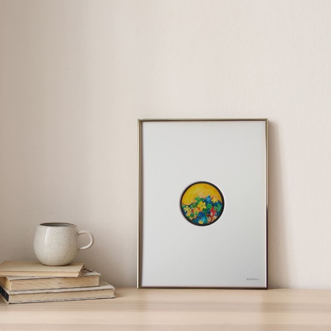 酢漿草のかわいい雰囲気、明るい黄色が空間を清らかに、明るくします。季節にこだわらず、好きな花の絵を生活の中で楽しんで下さい。